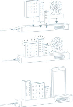 INsight的城市桌上燈,是把不同城市中具特色的代表建築,以簡約線條再度呈現。運用碳鋼,再配上柔和的暖燈光,把大廈線條散發出來。木座還可以擺放電話和擴音,在繁忙工作中,細聽音樂來緩和緊張。用家也可以根據喜好自行堆砌不同大廈,打造獨一無二的專屬小城市。